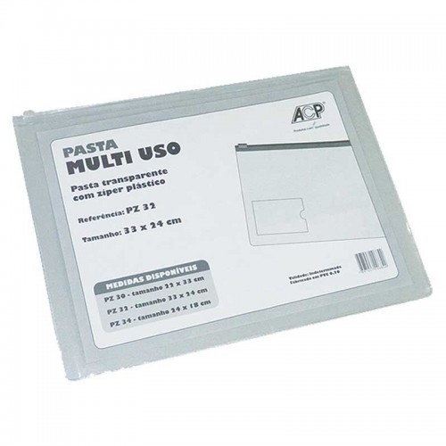 Descrição: O Malote Pasta Multiuso com Zíper 33x24 ACP PZ-32, disponível na 3G Papelaria, é a solução ideal para organizar, guardar e transportar documentos, materiais e objetos maiores com praticidade e segurança. Fabricada em material cristal transparente e resistente, possui fechamento com zíper plástico de fácil manuseio.